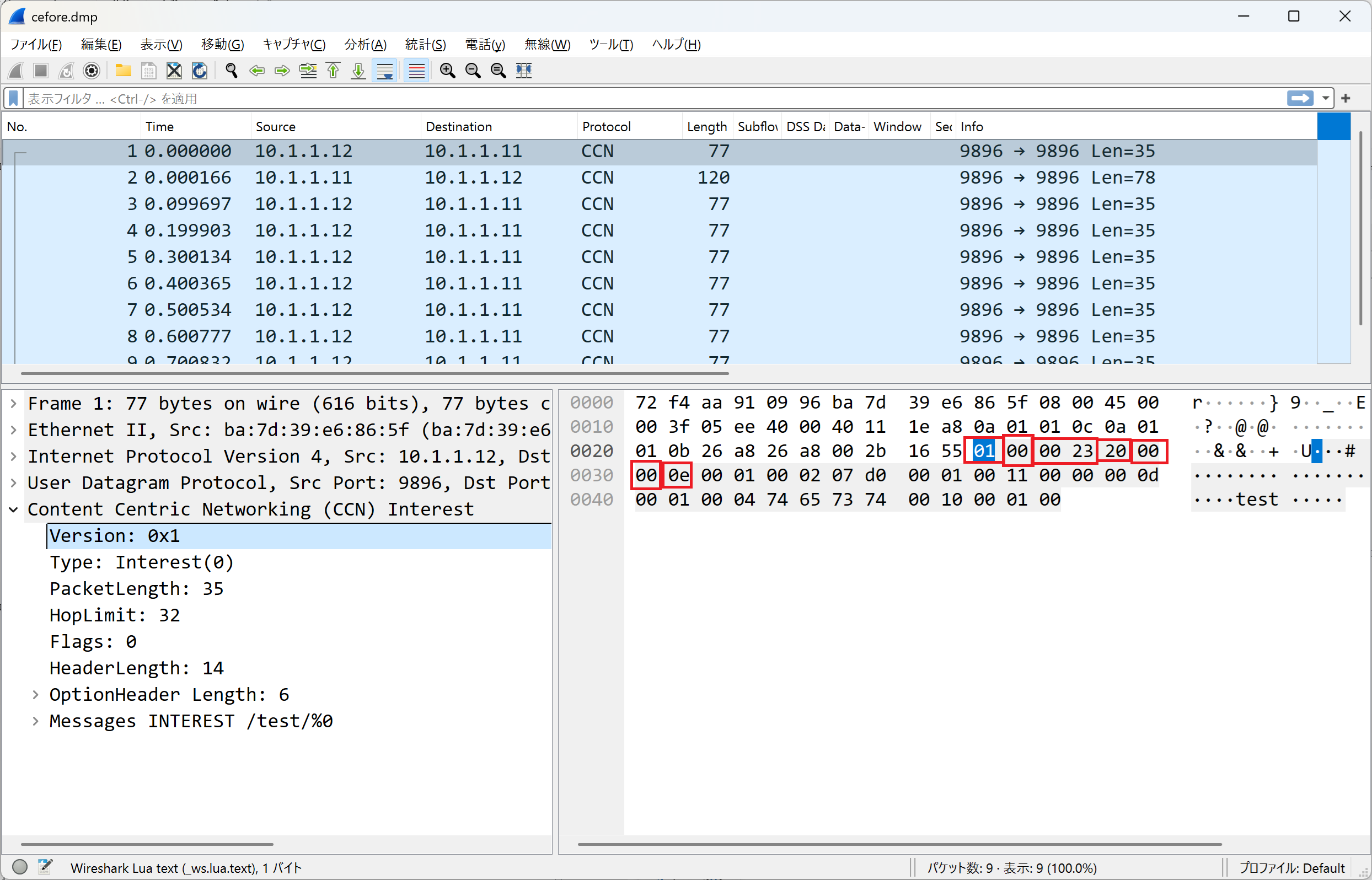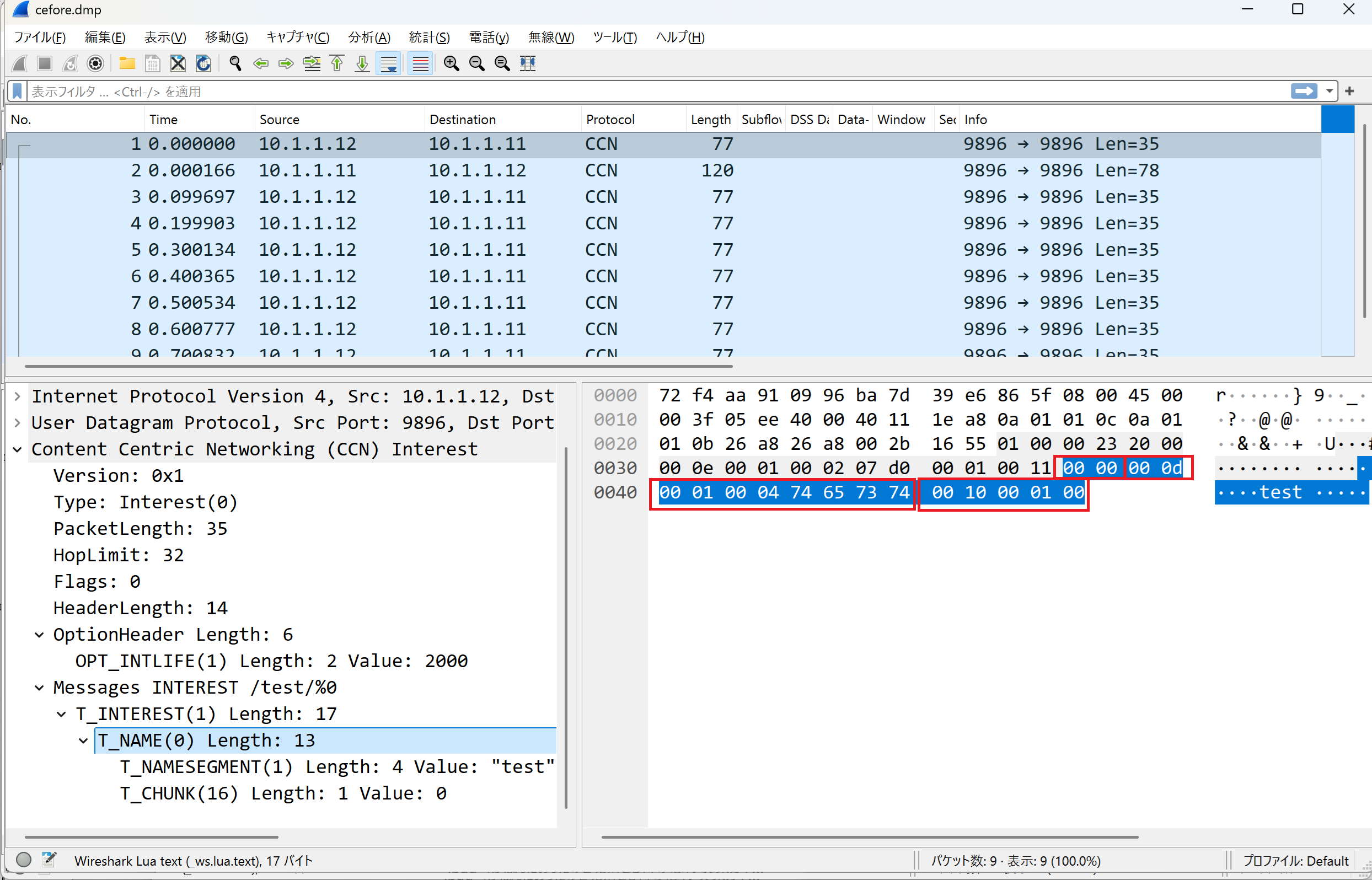 このときのCCNxパケットのやりとりをWiresharkでキャプチャしてみましょう。