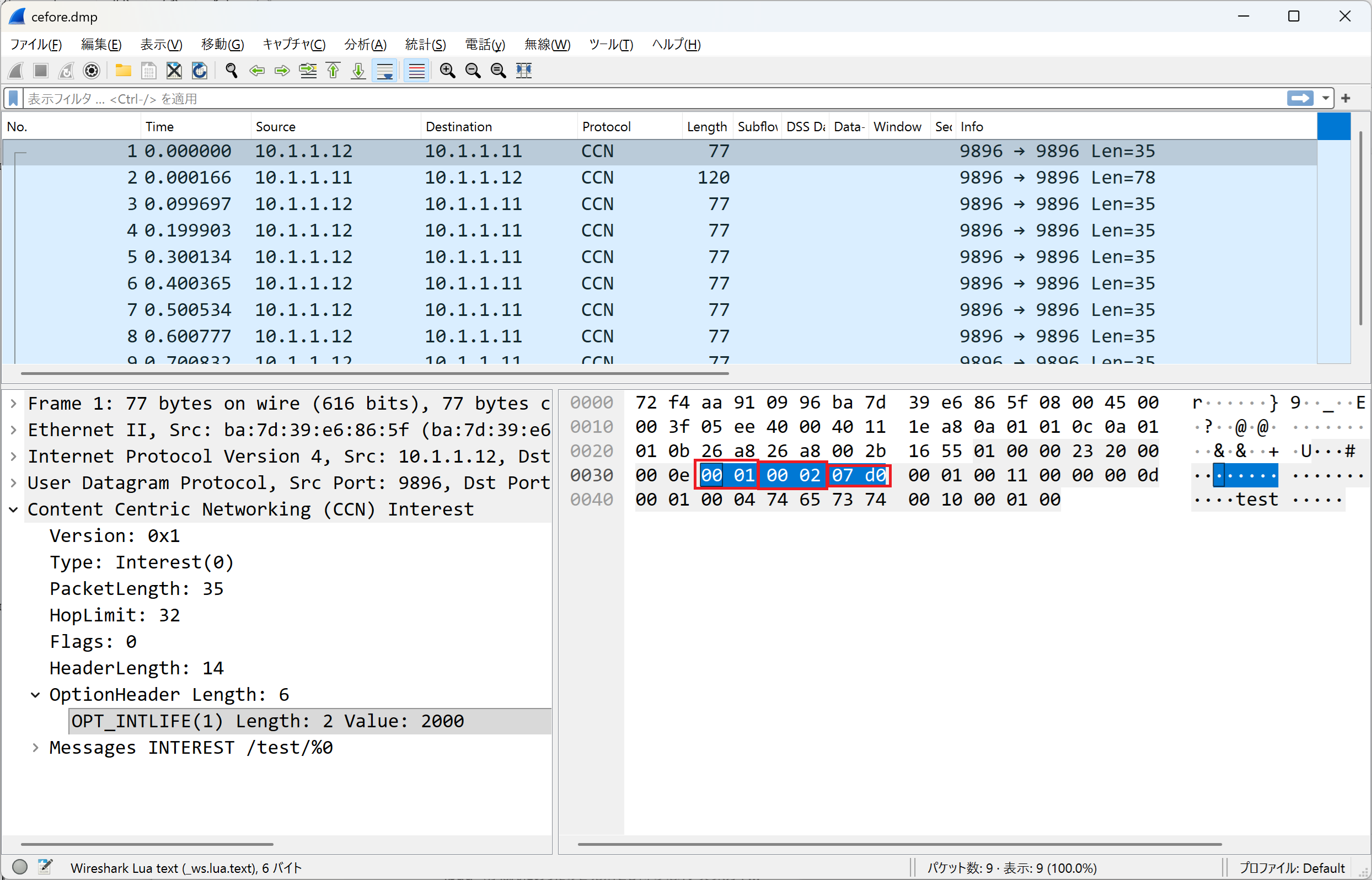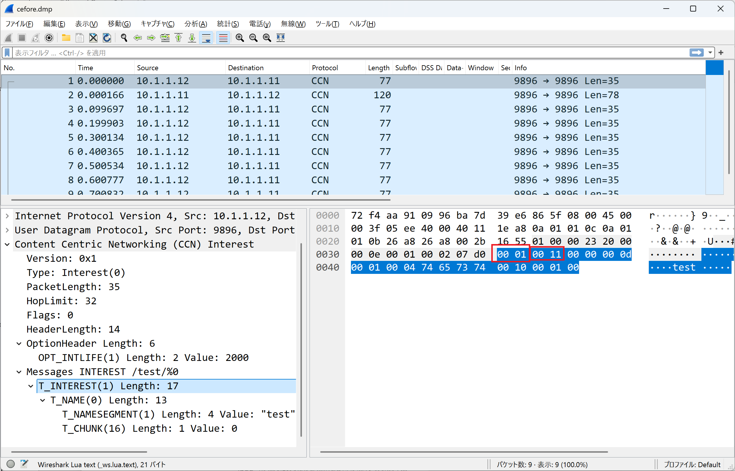 githubのceforeのリポジトリからLUAファイルをもってきてWiresharkに登録すると、CCNxパケットが解析できて便利です。CeforeのCCNx実装はIPのオーバーレイですので、UDPパケットの中にCCNxパケットがおさまっている形になっています。